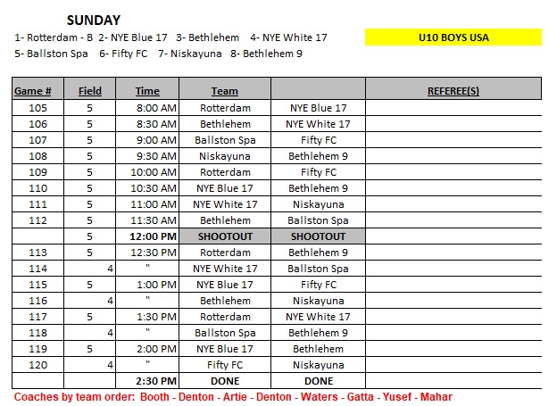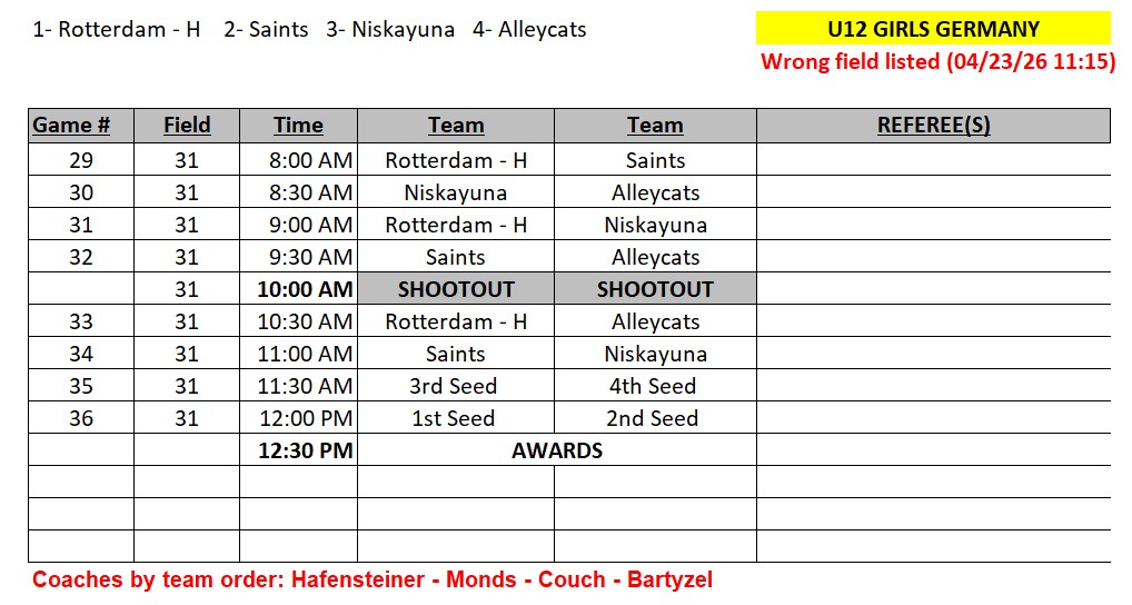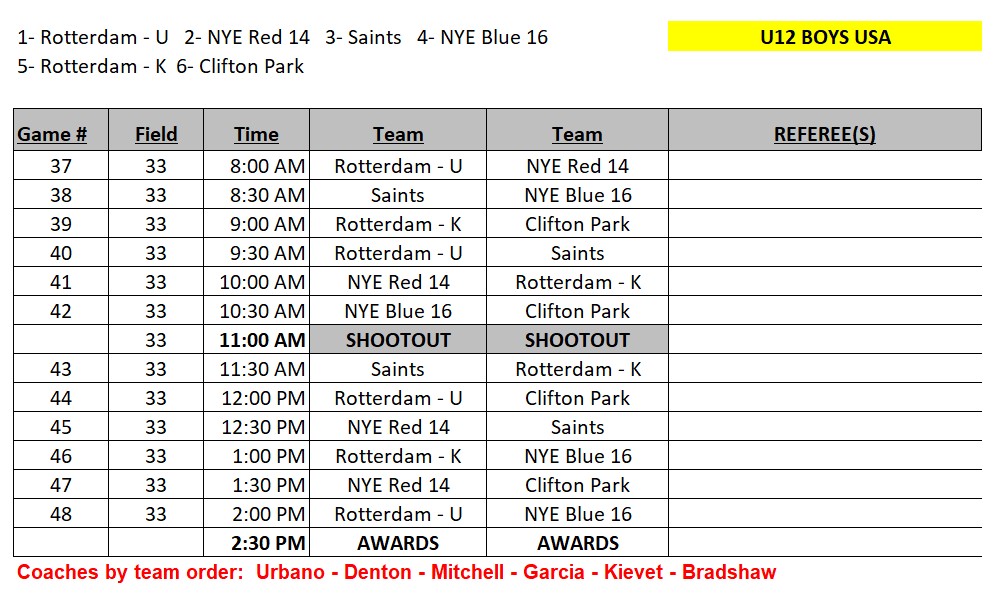 The location of the tournament is at the Rotterdam United Soccer Complex located on Princetown Road. This outdoor grass tournament is an USYSA sanctioned tournament through Eastern New York Youth Soccer Association, Inc. For more information, [click here] to contact our tournament director, Scott Byrnes. In your email, please include your club name, age group (ie BU12), division "A" or "B" and your title (coach, manager or other), we get over 75 teams in, we need a little help.
