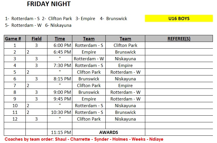 Friday Night - Boys & Girls U16 -- (Approx 5:00pm-11:30pm)