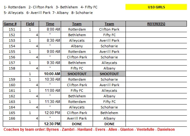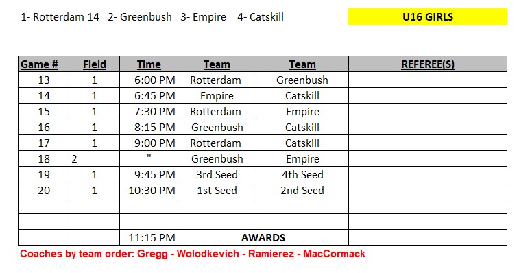Participating Clubs: Albany, Alleycats, Averill Park, Ballston Spa, Bethlehem, Brunswick, Calcio, Capital City, Catskill, Clifton Park, Colonie, Coliseum, Empire, Fifty FC, Greenbush, Niskayuna, NY Elite, Queen City, Saints, Saratoga, Schoharie