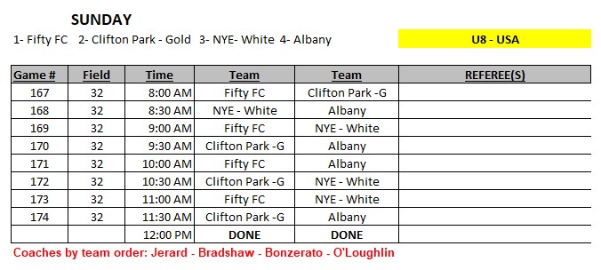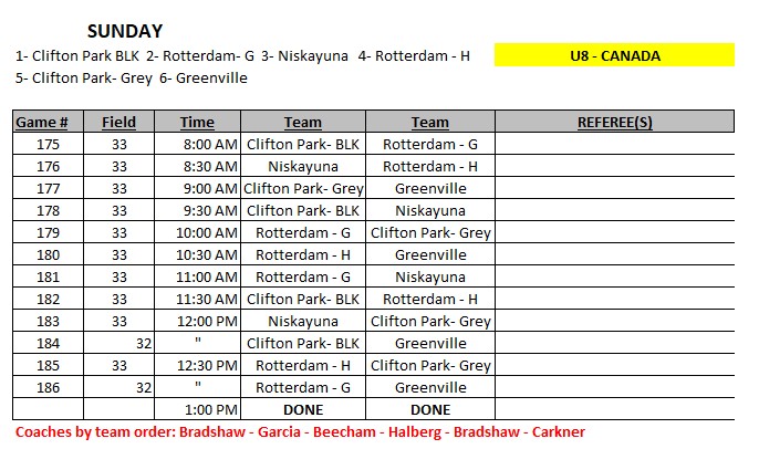 Sunday - Boys and Girls U8 and U10 -- (Approx 8:00am - 2:30pm)
